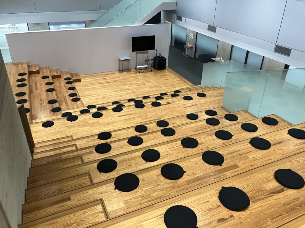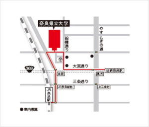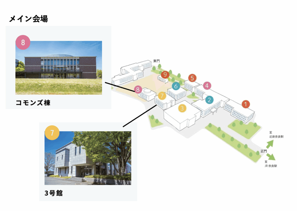 メイン会場は、奈良県立大学キャンパス内の「コモンズ棟」という建物になります。正門から入り、まっすぐ奥の建物へと進んでください。