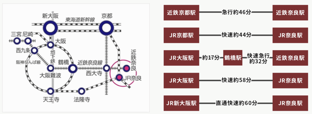 JR奈良駅、近鉄奈良駅からそれぞれ徒歩10分程度